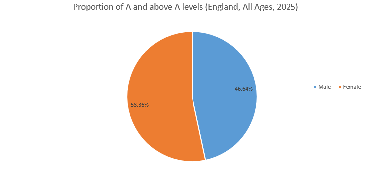 There is a clear variable that needs to be considered in assessing relative performance at the higher level. In addition, if fewer boys study A levels than girls – then the average ability of boys will be higher (remember the ‘performance’ the media and Ofqual use is performance within their own gender only, not the overall numbers of males and females taking them).