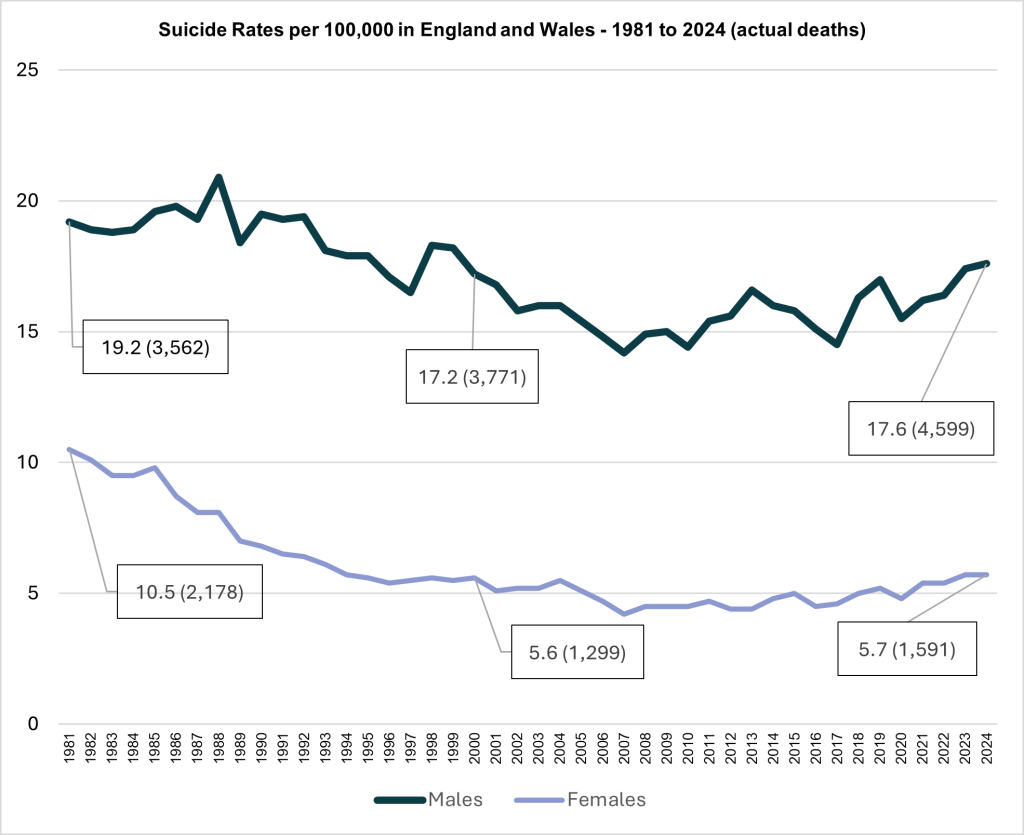 Figure 1: Suicide Rates per 100,000 in England and Wales – 1981 to 2024 (actual deaths)