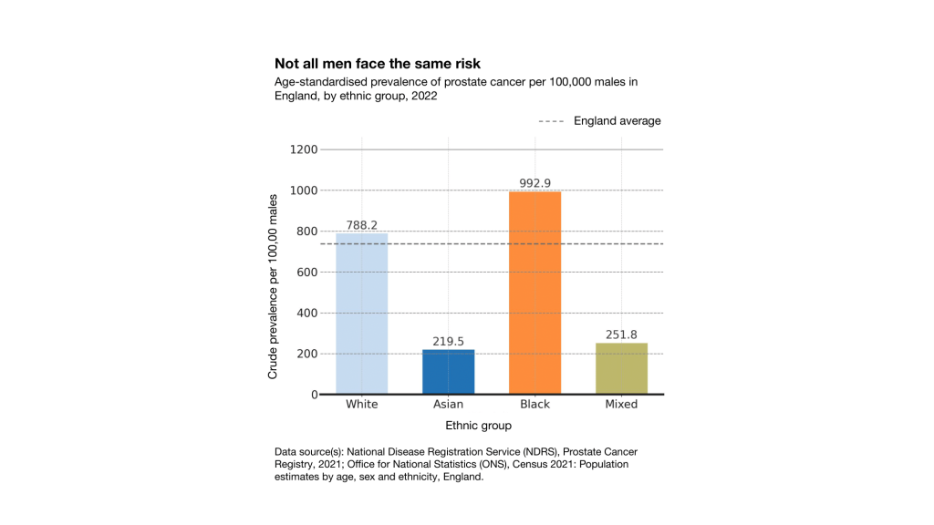 Importantly, not all men face the same risks. Ethnicity, age, genetics, and wider social factors all interact to shape outcomes (Dee et al., 2025). Recent registry data reveal stark inequalities: using case counts from the National Disease Registration Service (2021) and denominators from the Census 2021, crude prevalence per 100,000 males is significantly higher among Black men compared with other ethnic groups.