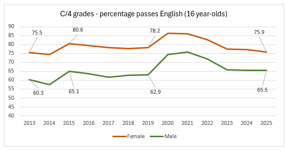 The broad picture shows that boys’ pass rates have improved over the last ten years (66% in 2015 and 67.5% in 2025) but it is not huge progress. The figures are ticking up coming out of the pandemic period.