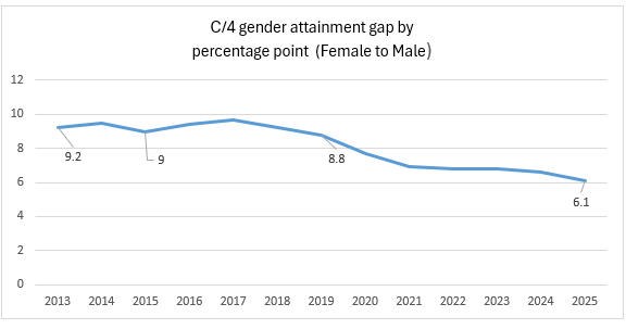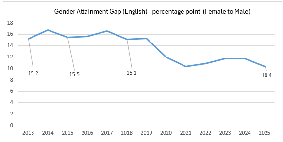 The broad picture shows that boys’ pass rates have barely improved since 2015 (65.1% in 2015 and 65.5% in 2025) so there has been little progress.
