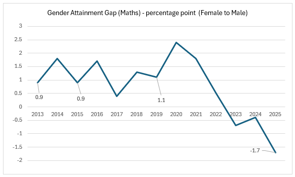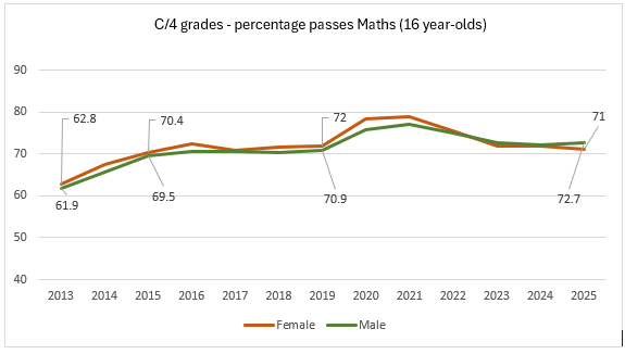 The broad picture shows that boys’ pass rates have made positive progress in Maths since 2015 (72.7% in 2015 and 69.5% in 2025).