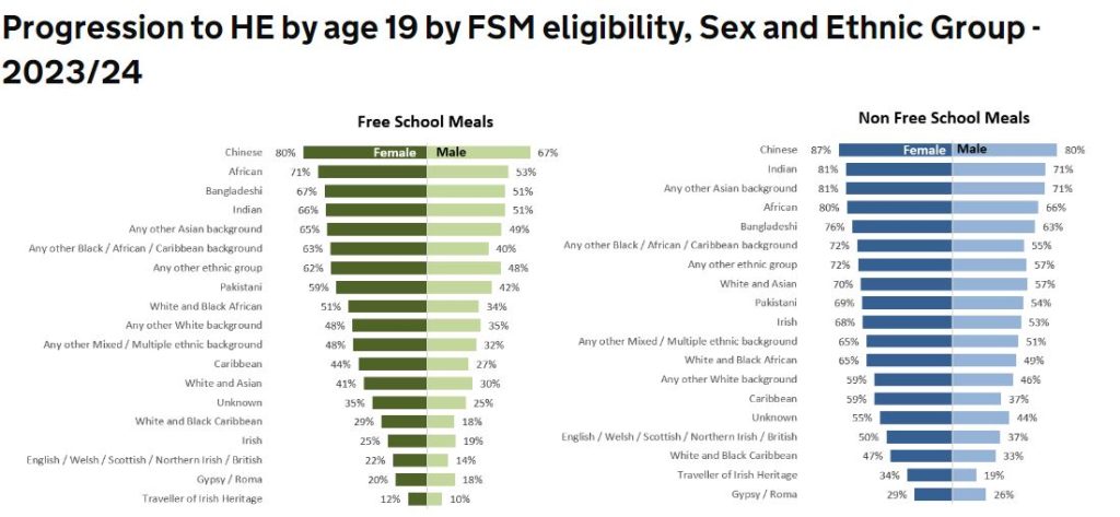 As well as showing that those on free school meals are less likely to pursue higher education than their ethnic peers, it shows that 19 and under young men are behind their family peers in each ethnicity category, irrespective of whether they are both on free school meals.